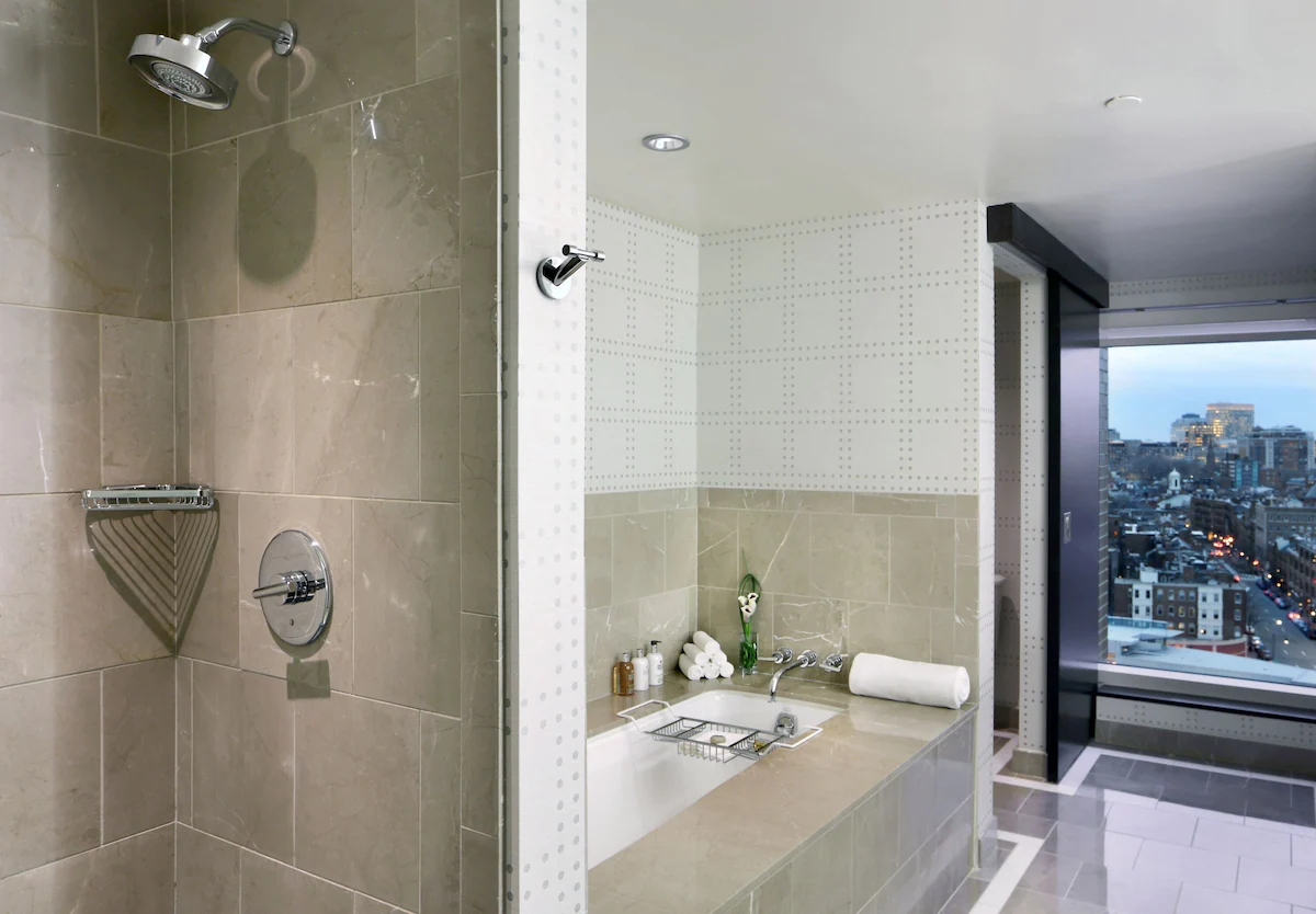 Each one-bedroom suite has a master bedroom with a king bed, one and a half bathrooms, separate living room/dining area with panoramic direct views of the Boston skyline including Beacon Hill and The Charles River. The suite has floor-to-ceiling windows and is appointed with imported bed linens, a 55-inch flat panel HD-LCD television, bathrobe, in-room safe, mini bar, two VOIP telephones and a four-fixture bathroom with environmentally–friendly Molton Brown bath and body care products. This room also has the capability to become a two-bedroom suite by connecting to a Grand Deluxe Corner Double room.